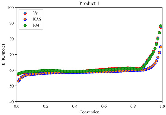 Figure 4 shows the fitting results of three different iso-conversional methods to the exotherms obtained in DSC at three different heating rates and the corresponding conversion of the product 1 at each heating rate. Good reproducibility of the DSC experiments is evident from the replicate runs. The DSC exotherms of this product obtained at different heating rates show a single peak temperature. Therefore, it is reasonable to assume that the curing process of this product can be considered a single-step process for which the iso-conversional methods are recommended [38,39]. Among the three methods used, Friedman’s method is a differential method, whereas the KAS and Vy methods are integral iso-conversional methods. It is evident from Figure 4 that the Friedman and Vy methods provide a nearly similar level of fit to experimental data, with R2 values of 0.9996 and 0.9989, respectively. The KAS method did not fit the experimental DSC data of this product very well, as shown in Figure 4c,d, with a relatively low R2 value of 0.9600. Figure 4d clearly shows that the KAS method underpredicts the conversion at low temperatures, while at high temperatures, the conversion is overpredicted by this method.