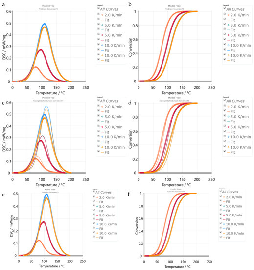 (a,b) Fitting of DSC exotherm and conversion of product 2 with Friedmann’s method. (c,d) Fitting results of DSC exotherm and conversion of product 2 with KAS method. (e,f) Fitting results of DSC exotherm and conversion of product 2 with Vy method.