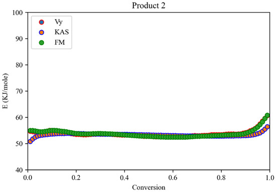 Comparison of E vs. α using Friedmann, KAS, and Vy methods for the product 2.