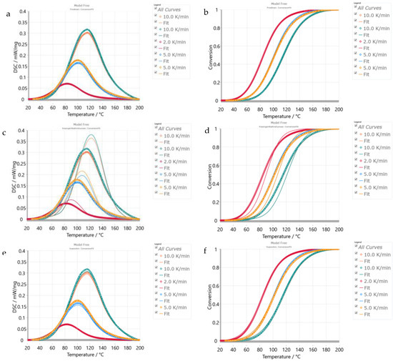 (a,b) Fitting of DSC exotherm and conversion of product 3 with Friedmann’s method. (c,d) Fitting results of DSC exotherm and conversion of product 3 with KAS method. (e,f) Fitting results of DSC exotherm and conversion of product 3 with Vy method.