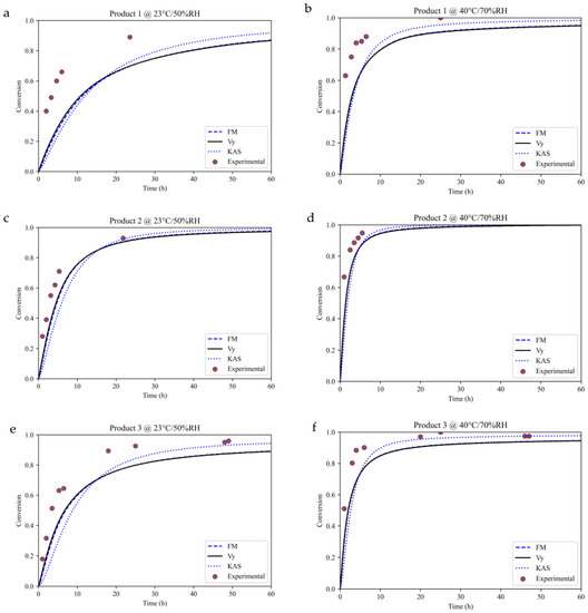 The apparent activation energy for each epoxy-amine product, estimated by using three different iso-conversional methods, was used to predict the degree of cure of each product under isothermal conditions of 23 °C and 40 °C using the Kinetics NEO software. The details regarding the equations used to predict the isothermal conversion using the apparent activation energy are published elsewhere [6,38,39]. These predictions are compared with the experimentally measured isothermal conversion of the corresponding product at 23 °C/50% RH and 40 °C/70% RH in Figure 10. It is evident that all the used iso-conversional methods underestimated the isothermal degree of cure of each product. The highest underpredictions were observed for product 1 for which the differences between the experimental and predicted values were found to be as high as 69% for some data points. The average error between the experimental and predicted values at 23 °C and 40 °C for product 1 was 52% and 29%, respectively. It is important to mention that the difference between the experimental and predicted values is high at low conversions, as can be seen in Figure 10. The most probable reason for this mismatch between the experimental and predicted isothermal conversion of these products is the fact that the non-isothermal DSC experiments did not consider the effect of humidity on the curing process of the used products since DSC experiments were performed under continuous nitrogen flow. On the other hand, isothermal curing of the samples of each product was performed under fixed humidity levels of 50% and 70% for a given time. It is well known that water acts as a catalyst for epoxy-amine crosslinking reactions [2,3], and consequently, the experimentally measured conversion of each product was higher than that predicted by the three different iso-conversional methods. Figure 10 also shows that the isothermal conversion predicted for each product at two temperatures by employing the KAS method is initially lower and finally higher than those predicted by the Friedman and Vy methods. This can be attributed to the activation energy values estimated by the KAS method, which are lower than those calculated by the Friedman and Vy methods, as discussed in the previous section. Note that the isothermal predictions obtained by employing the KAS method are less reliable due to the poor fitting of the non-isothermal DSC exotherms (see, e.g., Figure 8c). These results clearly show that the non-isothermal DSC experiments may not capture the effect of humidity on the activation energy for commercial epoxy-amine products.