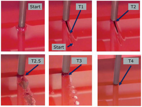 The drying or curing speed of commercial coatings is typically measured by following the ISO 9117-4:2012 standard or the ASTM D5895 standard. It is generally accepted that the faster the drying time of a coating, the faster the coated structure can be handled for the next phase of construction or put back into service. The drying times of commercial organic coatings are measured at different curing conditions, which allows one to compare the drying or curing speeds of coatings under the conditions of interest. The details related to the required equipment and the procedure for these tests can be found elsewhere [45,46]. The outcome of this test is typically related to five different times: the start of drying/curing (T0), set-to-touch time or end of flow back (T1), surface dry or tack-free time (T2 or T2.5), surface hardening commenced or hard dry time (T3), and surface hard or through-dry time (T4). A schematic representation of these times is shown in Figure 11.