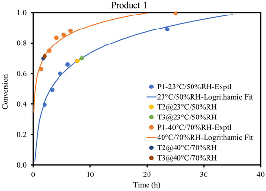 Fitting of the isothermal cure data of product 1 at two different curing conditions with the logarithmic function in MS Excel. Conversion at T2 and T3 drying times calculated by using the fitted equation is plotted with different colors.