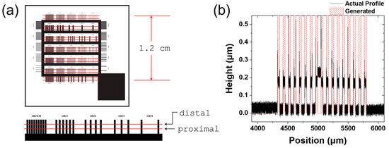 (a) (top) Full feature test pattern and (bottom) single row demonstrating the distal/proximal scans. (b) Actual uncoated test pattern profile (black) compared to calculated binary profile (shaded red). An error can be observed in the center of the grating that has been corrected in the model.