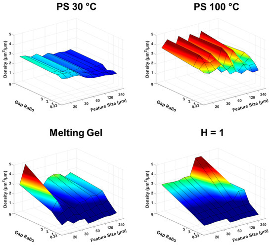 Moving onto the PS sprays, we do not see evidence for a thickness gradient with relative grating position (Figure 2). While the 100 °C increases in density with increasing gap, this is not seen in the profile data as we saw with the MG, indicating that the trend is due to metric bias. On the other hand, for both sprays, we see a slight trend with respect to feature size with higher densities on smaller features (Figure 3). Importantly, this trend differs from the biases represented by the simulated data, indicating that it is a real effect. We also see that, on average, the 100 °C spray has a higher density than the 30 °C does. However, the 100 °C also has greater variation, appearing to trend with the scan’s local position within the grating (distal/proximal) and not with the position on the test pattern.