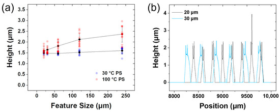 From the height data, we see further variation between the 30 °C and 100 °C samples (Figure 4a). For 100 °C PS, we see that a definite trend exists for feature size. Demonstrating the lack of thickness gradient, we see that the 30 µm features appear slightly taller than the 20 μm features do, despite the 20 µm feature’s close physical proximity to the tallest features, 240 μm (Figure 4b). Looking at all the data points, we see that the 30 °C PS height barely changes with feature size. Averaging these data points, we obtain a height of 1.51 µm ± 0.10 for 30 °C PS features. This differs from our prior results that showed increasing deposition thickness on larger features [22]. This is likely the effect of a reduced spray delivery rate from a combination of (1) distance, (2) flowrate, and (3) overall pattern area, which, for this pattern, is ~0.9 cm2 and, for the earlier work, was sub-mm2. For this reason, the current result can be more fully considered SLED. This is reinforced by the templated SL thickness also differing from the SL thickness observed for PS on a bare wafer, which is ~2.5 µm [10,11]. This indicates that the presence of the charged mask makes the exposed template a less favorable target than the supporting ground, reducing the thickness needed to repel incident spray. This is similar to results reported by Kingsley et al., which indicated that small targets receive very little incident spray when depositing in the SL regime [21].