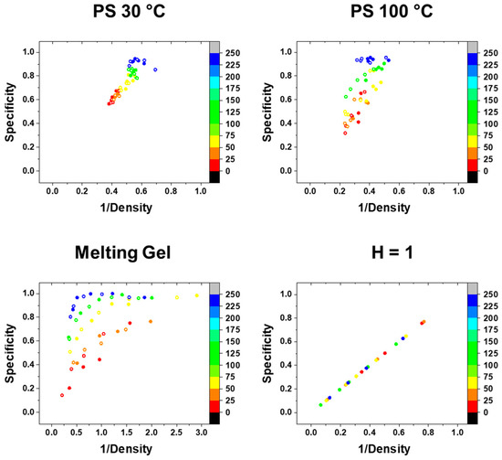 Specificity vs. 1/Density with color maps denoting gap ratio.