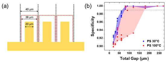 We create a new binary model profile with wider features to capture this scenario. The width of a single feature and gap is added, and the feature is expanded to fill 90% of this space (Figure 8a). Gratings that only include a single feature are excluded from this analysis. While specificity increases, only material bridging the space directly in the center of the gap is penalized. Examining the results (Figure 8b and Figure S9) and cross-referencing with the profilometry scans (Figures S1–S3), we see that anything less than 99% has some features bridged by the coating. This gives us more concrete data for the limits of SLED. The 30 °C PS, below Tg, spray allows us to access features separated by gaps of 80–120 µm where 100 °C PS fails. We also see that the limit for 30 °C PS appears to be 60 µm gaps and below. Interestingly, this is irrelevant of feature size, telling us that feature size controls the specificity and the density to some degree, but ultimately, the amount of spreading is relatively similar for all features. Therefore, the size of the gap is the only important factor in this regard.