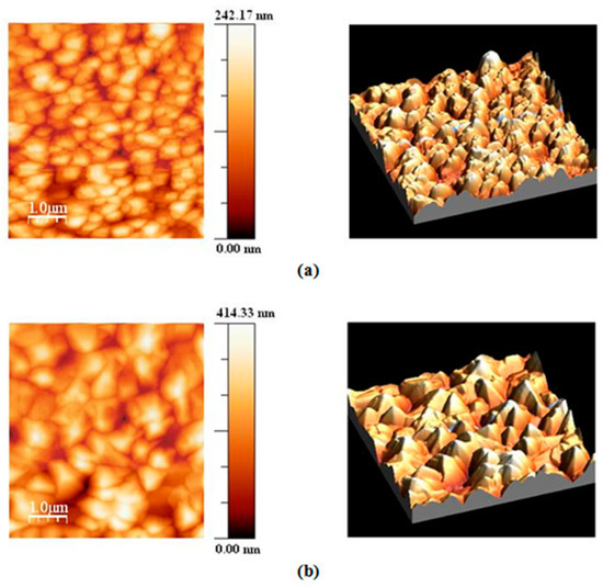 According to these results [30,32] the root mean square (RMS) of the studied films was decreased when doped with Ni. Estimation of the RRMS in our study demonstrates opposite results. For the films with Ni content of x = 0.02 the average roughness RRMS = 35.5 nm, whereas for the films with Ni content of x = 0.06 this parameter is larger RRMS = 65.7 nm. The results of AFM studies of all samples also indicate the growth of columns perpendicular to the plane of any substrate used.