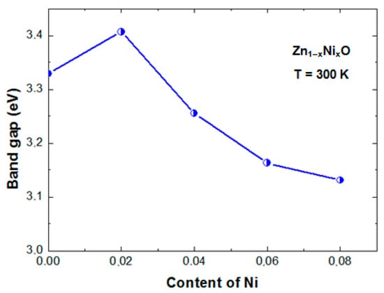 The optical band gap of Zn1−xNixO thin films as a function of Ni content (x).