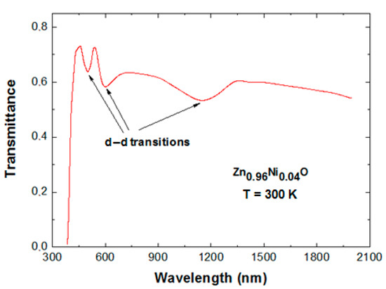 The initial increase in band gap from x = 0 to 0.02 the authors of the paper [37] have attributed to the s, p–d spin exchange interaction between the band carriers and localised spin of the transition metal ions. At the same time, the authors of the paper [43] have attributed this increase to the improvement of the crystalline structure of the films. Because of the nanostructured character of the prepared Zn1−xNixO films according to the demonstrated above TEM and AFM images the same mechanisms can be applied also to explain the observed Eg(x) dependence (Figure 6). Additional absorption below the absorption edge can be seen for slightly thicker Zn1−xNixO films compared to those we used for the analysis of the absorption edge. From Figure 7 we can see in the transmittance spectrum of Zn0.96Ni0.04O film three absorption bands in the wavelength range 480–2000 nm. The absorption peaks identified in the long-wavelength region of the spectrum are caused by d–d transitions in tetrahedrally coordinated Ni2+ ions. The observed peaks can be attributed to 3T1(F) → 1T1(G), 3T1(F) → 1T1(D) and 3T1(F) → 3T1(P) transitions of the Ni2+ ions [44,45,46,47].