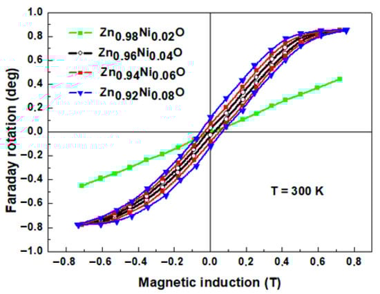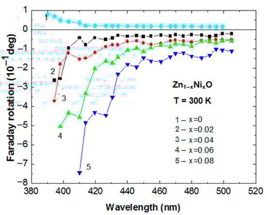 The magneto-optical Faraday effect combines and synthesises two areas of physics—optics and magnetism. This effect occupies an important place in the study of the magneto-optical properties and the magnetic subsystem of various materials, in particular, DMS. The magnitude of the Faraday effect in DMS is directly related to the exchange interaction between the band states of electrons (holes) and localised d-(f−) electrons of magnetic ions and is proportional to the magnetisation of the magnetic subsystem. To our best knowledge, the magneto-optical Faraday effect was negligible for Ni-doped zinc oxides [43]. Figure 9 shows the spectral dependence of the Faraday rotation in Zn1−xNixO thin films. The increase in the Faraday rotation in the region of the absorption edge is clearly observed with the increase in Ni content. As noted above, for DMS materials, the exchange interaction between band carriers and magnetic ions (s, p–d exchange interaction) leads to a strong increase in the Faraday rotation [48,49].