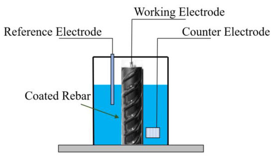 Steel rebars protected by coatings with high corrosion resistance can prevent corrosive media from attacking the metallic surface, which significantly extends the service life of structures. The electrochemical impedance spectroscopy (EIS) test was conducted to evaluate the corrosion resistance of the coated rebars, as this is a well-established techniques that can provide quantitative results [40].