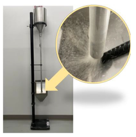 The falling sand abrasion test was performed in accordance with ASTM D968 [31] to characterize the anti-abrasion property of coated steel rebars. The test setup is presented in Figure 2. During the test, silica sands fell from the top container into a 36-inch-long tube before impacting the coated sample. The abrasion resistance was quantified as the required volume of sand vs. thickness loss, which can be calculated using the following equation: