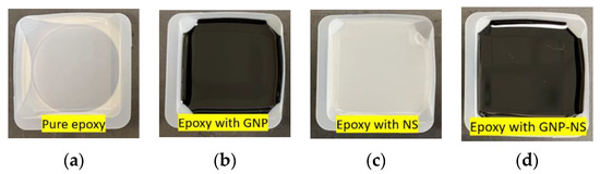 Appearance of epoxy and nanocomposites, (a) pure epoxy, (b) epoxy with GNP, (c) epoxy with NS, and (d) epoxy with GNP-NS hybrid fillers.