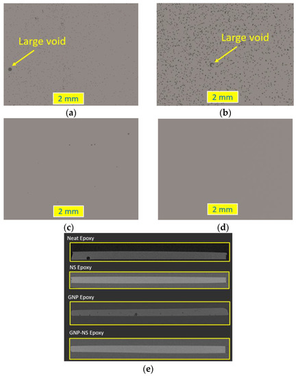 Micro-CT scan images for (a) neat epoxy, (b) graphene–epoxy, (c) nanosilica–epoxy, and (d) graphene–nanosilica epoxy, and (e) cross-sectional images of each sample.