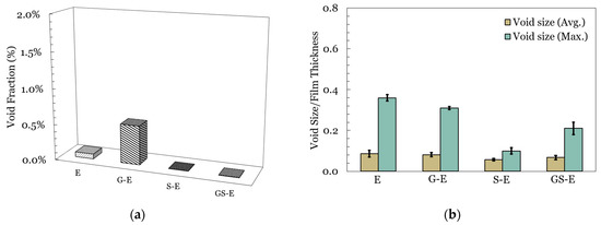 Figure 7a presents the void fraction of each group, and Figure 7b shows the results of void size vs. film thickness. Apparently, neat epoxy has a low void fraction of 0.07%, which is an acceptable value for a coating system; however, the large void size is the major drawback of neat epoxy in providing protection for steel rebar.