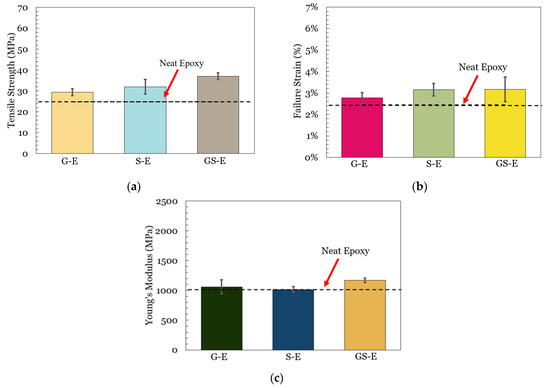 Tensile properties of each nanocomposite: (a) tensile strength, (b) failure strain, and (c) Young’s modulus.