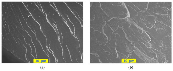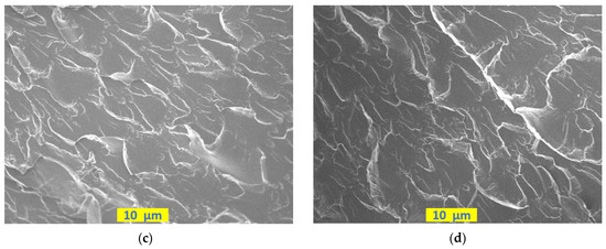 The SEM images of the fracture surface after the tensile test further confirmed the findings above, as shown in Figure 9. The neat epoxy showed a typical brittle tensile failure, with a relatively smooth surface with large cracks, as seen in Figure 9a. This type of failure implies the unmodified epoxy has weak impact resistance and fracture toughness. Conversely, all the nanocomposites exhibited a more complicated fracture surface, especially the GNP-NS composite. A similar fracture surface was found in the NS epoxy composite; however, some large cracks were also observed, indicating weak spots created by poorly dispersed nanoparticles. The large cracks in the GNP epoxy showed good agreement with the tensile properties as the GNP provided the weakest improvement among all the nanofillers. The GNP-NS epoxy had stronger energy absorption and improved fracture resistance, which might indicate the strong adhesion between the reins and well-dispersed nanofillers in the polymeric matrix.