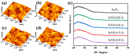 AFM images of (a) 20:1, (b) 18:1, (c) 15:1, (d) 10:1 InTiO thin films, and (e) XRD patterns.