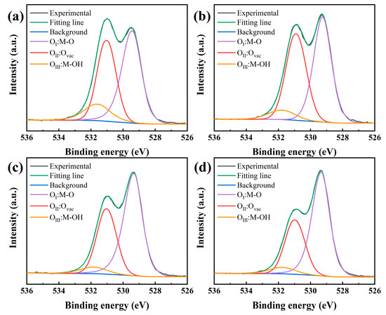 XPS O 1s of InTiO thin films with various composition ratios of (a) 20:1, (b) 18:1, (c) 15:1, and (d) 10:1.