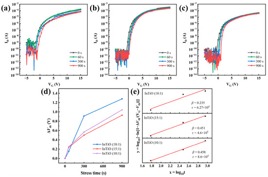 PBS of InTiO TFTs with various Ti4+ concentrations, (a) 18:1, (b) 15:1, and (c) 10:1. (d) The dependence of ΔVth on the stress time of InTiO TFT devices. (e) The fitted curves described by Equation (5).