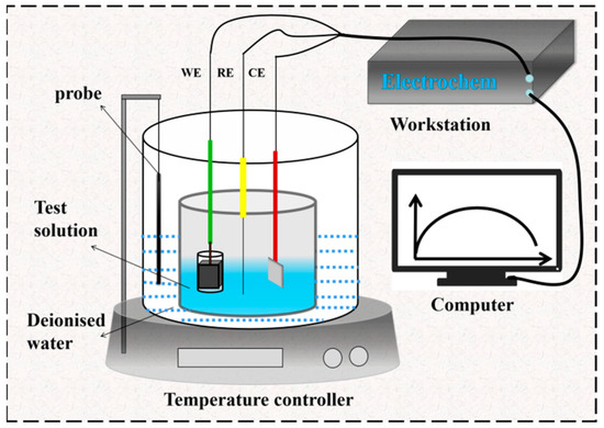 The instrument used for the tests is an electrochemical workstation (ChenHua CHI660E, Shanghai, China), as shown in Figure 1. The materials of the three electrodes were platinum sheet (auxiliary electrode), saturated glycerol (reference electrode) and Q235 carbon steel (working electrode) [16,17]. The open circuit potential (EOCP) was first measured for 1 h. Secondly, the impedance spectra were tested in the frequency range from 100 kHz to 10 mHz and at an AC amplitude of 10 mV. Resolving with Zview software (2.70). Finally, Tafel curves were tested on Q235 carbon steel with polarization potentials ranging from −250 to +250 mV relative to the open circuit potential at a scan rate of 1 mV/s.