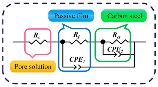 As shown in Figure 4, this equivalent circuit diagram has been used in many articles about corrosion and has been applied several times in alkaline environments [30,31,32]. For example, in Figure 4, there is a solution resistance (Rs); a thin film resistance (Rf); a charge transfer resistance (Rct), and constant phase angle elements (CPE1 and CPE2). The expression for a constant phase element (CPE) is as follows [33]: