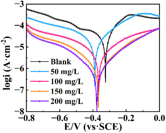 From Figure 6 we can see that the addition of IDS caused the polarization curves to move downward significantly. The polarization curves shifted in the direction of the negative potential. If the Ecorr of the inhibitor varies by more than 85 mV, it will be classified as an anode or cathode type [39,40]. The value of Ecorr shifted did not exceed 85 mV, denoting that IDS is a mixed-type inhibitor, inhibiting both anode and cathode. Table 3 illustrates that the values of Icorr and CR decrease significantly and the calculated value of IETP% increases and the IETP% value of IDS reaches 98.30% at 200 mg/L, which can indicate that the greater the concentration of IDS, the stronger the protective effect of the adsorption film.