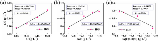 The adsorption isotherm is of great value in elucidating the form and mechanism of the adsorption of inhibitors. Therefore, we fitted various adsorption curves based on the average of the inhibition efficiencies shown in Table 4 to represent the surface coverage (θ) and used the correlation coefficient to select the most suitable adsorption isotherm for this experiment. As shown in Figure 7, We found that the adsorption of IDS matched the Langmuir adsorption isotherm (R2 close to 1). Where the three adsorption isotherms were calculated using these equations [41]: