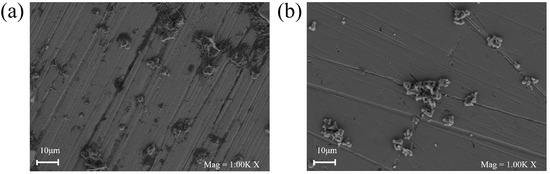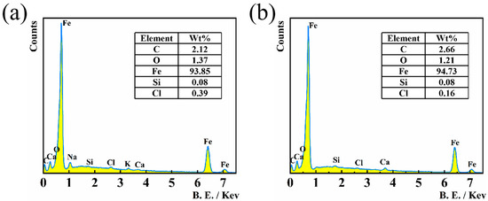 Figure 8a,b represent the SEM images of the Q235 carbon steel immersed in the simulated concrete pore solution without inhibitor and containing 200 mg/L IDS for 6h. We can see that the carbon steel surface is rough with deeper cracks and corrosion pits in Figure 8a, indicating that the surface has been attacked. Comparing the SEM image with 200 mg/L IDS added, the cracks and holes are reduced, and the surface is smoother except for the grinding marks. Figure 9a,b shows the corresponding EDS images. Analyzing the two EDS images, we can see the increase of C elements on the surface after adding IDS because it is present in the molecular structure of IDS. The reduction of O and Cl elements and the increase of Fe elements mean that the addition of IDS reduces the number of active sites on the metal surface and decreases the probability of corrosion. Besides, the carbon steel surfaces all have silicon elements left from the sandpaper grinding process.