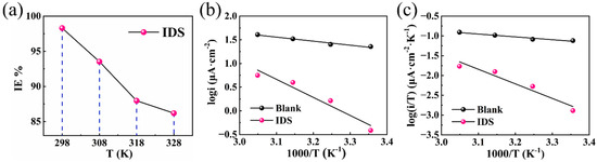 Tafel polarization tests were taken to investigate the IDS effect at different temperatures in this work. As shown in Figure 10, we can observe the corrosion current density increases with increasing temperature. From Table 5 and Figure 11a, the efficiency (IETP%) decreases with increasing temperature after adding 200 mg/L IDS, indicating high temperatures accelerate the corrosion and reduce the adsorption of IDS, which means that IDS molecule on the carbon steel substrate desorption occurs, contributing to a decrease in inhibition efficiency [44].