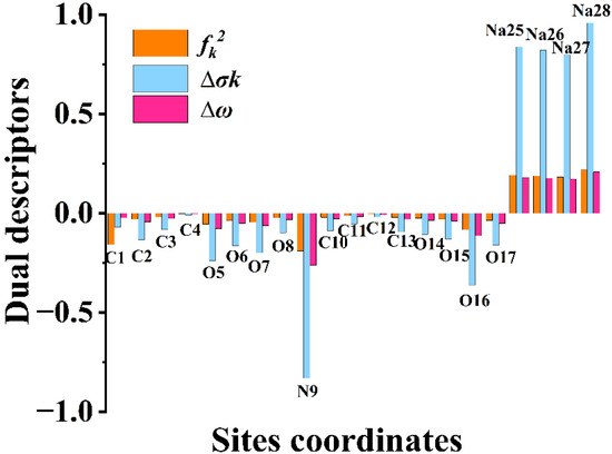 We used the Fukui index to study the specific reaction sites of IDS molecules in the adsorption process. Higher values indicate atoms with a high electron-giving capacity and a high reactivity to participate in the electron-philic attack, while higher values indicate atoms with high reactivity to participate in nucleophilic reactions [53]. The Fukui Index is summarised in Table 8. The results show that for the IDS molecule, the higher values were distributed among the Na28, Na25, Na26, Na27 atoms on the sodium carboxylate group, the higher values were distributed among the N9 atom in the amino group and the O16 and O5 atoms in the sodium carboxylate group. These atoms have a strong ability to accept and give electrons, respectively. The active sites are further observed by the dual local descriptors as shown in Figure 13. If the values (, and ∆ω) of the sites are less than 0, the process prefers electrophilic attack, but if the values (, and ∆ω) of the sites > 0, the process prefers nucleophilic attack [23]. In Figure 13, the order of the most active sites giving electrons is: N9 > O16 > O5, and the trend of electron-accepting ability is Na28 > Na25 > Na26 > Na27.