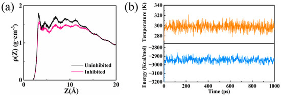 It is well known that corrosion occurs when water molecules in the air attach to the carbon steel surface, and the addition of IDS will replace the water molecules, thus inhibiting the corrosion of carbon steel. We can see from Figure 15a that the density of water molecules with the addition of IDS decreases within 20 Å, which is consistent with our experimental results.