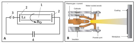 Design of plasmatron. (A): Schematic representation of a z-pinch apparatus. 1. plasma column, 2. electrodes, 3. arc gap, 4. capacitor battery. (B): Typical plasmatron configuration for atmospheric plasma spraying. © Creative Commons CC BY-NC-ND 4.0.