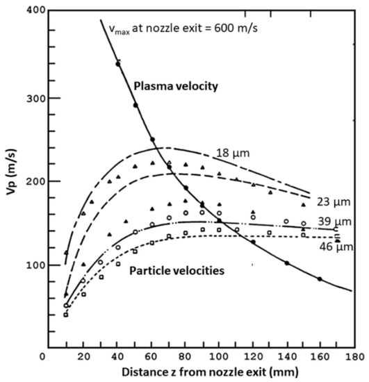 Importantly, the degree of momentum transfer depends on the size of the powder particles. A study that involved alumina particles injected into an argon/hydrogen plasma revealed that the supersonic plasma velocity (vmax = 600 m/s) decreases exponentially on exiting from the nozzle of the plasmatron (Figure 2). The injected alumina particles gain momentum slowly as they move along the pressure gradient because of their inertia. In this experiment, small particles of 18 µm diameter reached a maximum velocity of 220 m/s at the target distance of 150 mm, and larger particles with a 46 µm diameter reached a maximum of only 140 m/s. The figure also shows that the velocity attained by small particles decayed faster than that of large particles, due to the higher inertia of the latter [5].