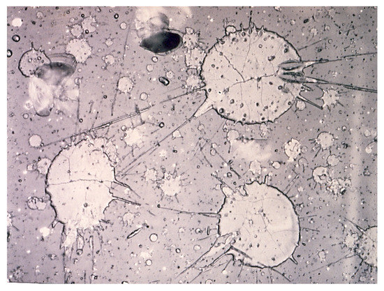Semi-molten or still solid larger particles impacting the surface of the substrate with supersonic velocity may generate a series of planar shock wave that, by an isentropic process, may reheat the already solid splat surface, thereby delaying freezing the newly arriving particles [27,28]. Figure 3 shows the frozen-in-time traces of superheated alumina particle splats. Such flow characteristics of molten particles are used in the so-called ‘wipe’ test prior to the coating process itself. A flat surface, such as a glass slide, is moved rapidly through the particle trajectory path to capture a few droplets the flattening characteristics of which, on impact, are used to estimate proper melting conditions and adjust plasma parameters accordingly [29].