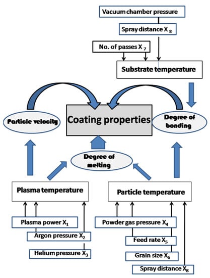 Figure 4 shows the three-level hierarchy of eight plasma spray parameters and their effect on coating properties. The first level shows the plasma spray parameters Xi that control the second level temperatures of the plasma (X1 to X3), the particles (X4 to X6, X8), and the substrate (X7 and X8). The third level constitutes particle velocity, degree of melting, and degree of bonding. These properties directly influence the properties of the coating [34].