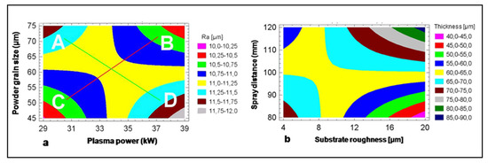 The interactions of plasma spray parameters X1 to X8, as shown in Figure 4, lead to complex relations that require judicious consideration when selecting their numerical values. For example, plasma parameters do not always act in the same direction, leading to characteristic saddle points of the response surface constructed from a statistical design matrix [35]. The statistical design of experiment (SDE) strategies are useful tools to control and hold (unwanted) parameter interactions in check. Figure 5a shows such a saddle point in the response surface contours of the average surface roughness Ra of plasma-sprayed Cr2O3 coatings deposited on a steel St37 substrate as a function of plasma power and powder grain size. Another saddle point (Figure 5b) was determined in the response surface of the coating thickness depending on substrate roughness and spray distance [7].