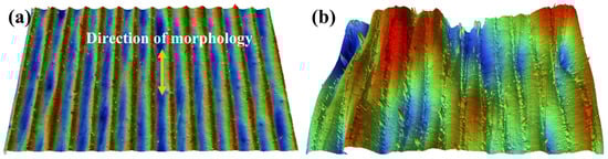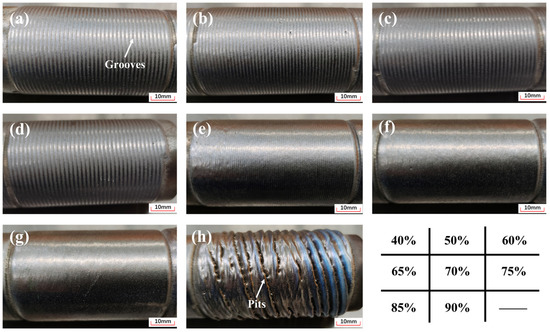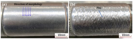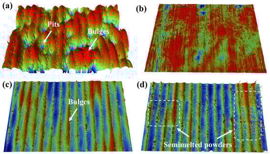 - The fluctuations of process parameters such as laser power, deposition speed, powder feeding speed, overlapping ratio, etc., adversely affect the stability of the molten pool, resulting in the formation of different surface morphologies on the EHLA JG-11 coatings, which are mainly shown as high surface flatness, deep pits, small peaks, poor directionality, etc.