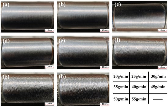 | No. | Laser Power (W) | Deposition Speed (m/min) | Powder Feeding Speed (g/min) | Overlapping Ratio (%) |