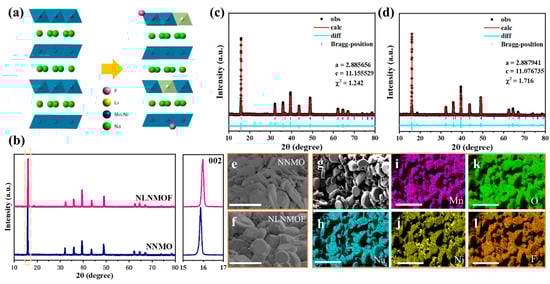 To identify the less explored effect of anion–cation dual doping, we successfully prepared the pristine and Li+/F−-modified NLNMOF materials and comparatively studied their structural and electrochemical properties as cathodes for SIBs. To start, Figure 1a illustrates the crystal structures before and after doping, where the Li+ ions tend to occupy the TM sites and the F− ions occupy the O sites in the doped structure [,]. Figure 1b demonstrates the XRD patterns of NNMO and NLNMOF, with their main diffraction peaks well indexed to the hexagonal phase system (JCPSD No. 54-0894). The enlarged view of the (002) peaks reveals a slight shift to the right after doping, indicating a shrinkage along the c-axis, which is most likely due to the smaller ionic radius of F− (133 pm) compared to O2− (140 pm) []. The drop in the c parameter is also confirmed by the Rietveld refinement results shown in Figure 1c,d. The slight increase in the a-axis parameter may be related to the substitution of Ni2+ (69 pm) and Mn4+ (53 pm) with Li+ (76 pm) with a larger radius. The SEM images for both samples are displayed in Figure 1e,f. NNMO exhibits surface-smooth primary particles in a plate shape and with sharp edges, while the NLNNMOF particles show roughened surfaces with more round edges, which is similar to the observation seen for the F-doped NNMO samples reported by Chen at al. []. The EDS mapping, shown in Figure 1g–l, indicates that all elements, including F, are uniformly distributed.