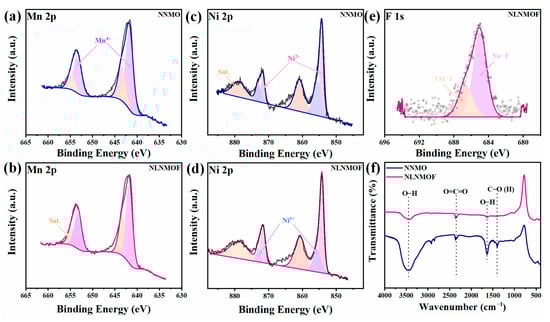 XPS spectra of NNMO and NLNMOF, (a,b) Mn 2p, (c,d) Ni 2p, and (e) F 1s. (f) FTIR spectra of NNMO and NLNMOF.