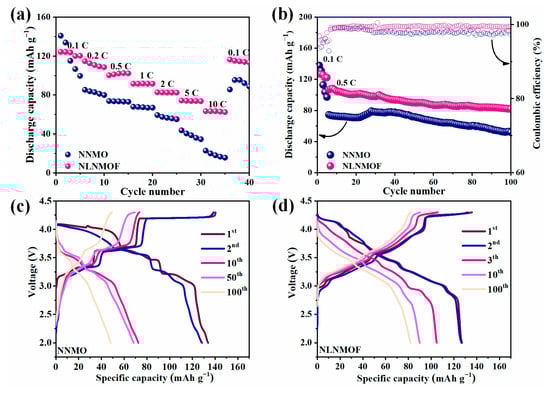(a) Rate and (b) cycling performances of NNMO and NLNMOF electrodes between 2.0–4.3 V. The charge–discharge profiles of (c) NNMO and (d) NLNMOF for the 1st, 2nd, 10th, 50th, and 100th cycle.