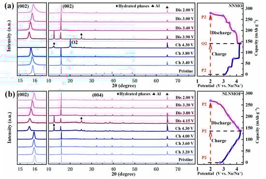 In order to probe the structural evolution of NNMO and NLNMOF electrodes during the charging and discharging process, the ex situ XRD patterns were collected (Figure 4). The (002) peaks are enlarged on the left to illustrate the major trend. For NNMO, the (002) peak shifts to a lower angle with charging, indicating the expansion along the c-axis and the increase of the layer spacing; [] during discharging, it shifts back to its original position. However, the (002) peak disappears above 4.0 V, while an extra peak, located at 20°, appears, disclosing the presence of a harmful P2–O2 phase transition (Figure 4a) []. The evolution of the (002) peak for NLNMOF follows a similar route, except there is no O2 phase formation (Figure 4b). Monitoring the (004) peaks of NNMO and NLNMOF returns the same trend. Obviously, the P2-layered structure of NLNMOF can be well maintained during the charging/discharging process, as the extraction and insertion of Na+ in NLNMOF proceeds via a highly reversible P2–P2 solid solution reaction []. It should be noted here that the peaks at 12.5° and 25.2° are hydrated phases, most likely introduced during the sample preparation process. It has been frequently reported that when the Na+ content is less than 1/3, there is a strong tendency for NNMO to absorb water and form hydrated phases [,]. Postmortem electrode characterizations were conducted to support the ex situ XRD analysis. Figure S6 shows the XRD patterns of both cathodes after cycling, where NLNMOF still exhibits a well-defined P2-type structure. In stark contrast, some peaks belonging to the P2 structure significantly weaken and even disappear for the cycled NNMO. This provides evidence for the irreversible P2–O2 phase transition that has led to the decrease of crystallinity and serious destruction of the crystal structure [,].