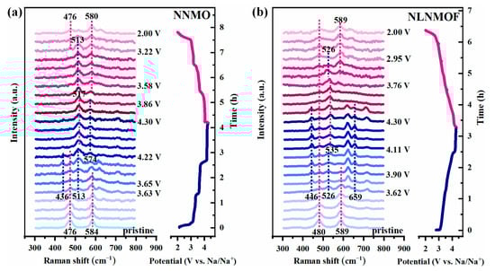 In situ Raman spectra of (a) NNMO and (b) NLNMOF electrodes acquired during the first cycle.