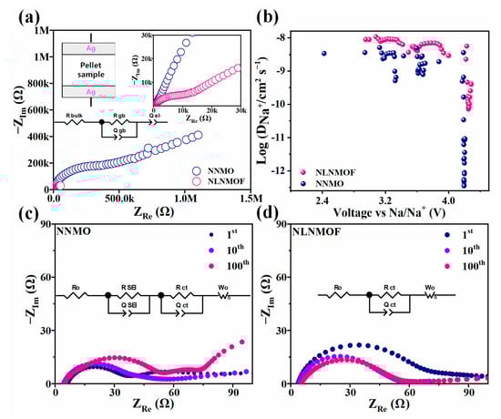 (a) Nyquist plots for NNMO and NLNMOF pellets coated with Ag paste on both sides and the corresponding fitting curves. (b) The sodium-ion diffusion coefficient (DNa+) of Na/NNMO cell and Na/NLNMOF cell cycling between 2.0 V and 4.3 V for the charge states of the first cycle. Nyquist plot of (c) NNMO and (d) NLNMOF, respectively, and the equivalent circuit is shown in the inset.