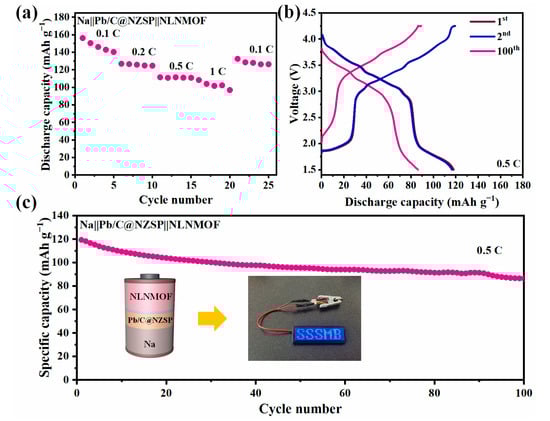 (a) The rate and (c) cycling performance of the solid-state Na||Pb/C@NZSP||NLNMOF battery between 1.5 V and 4.25 V. (b) The charge–discharge profiles for the 1st, 2nd, and 100th cycles.