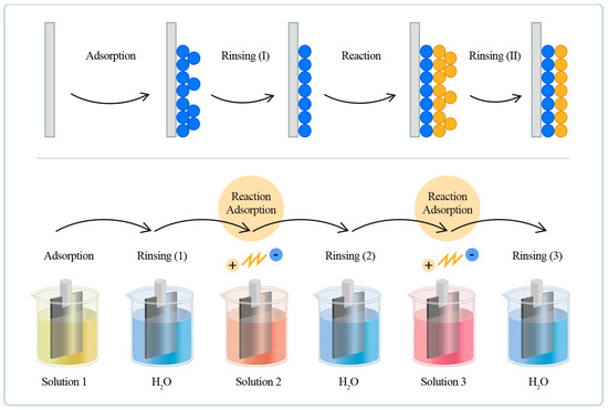 The SILAR method is based on the adsorption of ionic particles of solutions on the substrate surface. Adsorption triggers a chemical reaction at the interface which leads to the formation of an insoluble product. This is why the primary precursor from which the thin film is formed is of crucial importance (Table 1). The atoms of this film will be adsorption centers for the further deposition of material. The removal of excess and weakly bonded atoms is a crucial factor for the good adhesion of films to the substrate. Therefore, washing the sample is an important step (Figure 1).