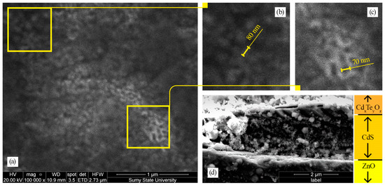 Figure 2 shows an image of the surface morphology of the CdxTeyOz/CdS/ZnO heterostructure, taken at the maximum allowable approximation (magnification 100,000 times). As a result of the excessive magnification and translucency of the material, the quality of the image is not very high, but it allows us to assess the main morphological characteristics of the formed structure. The surface is covered with small spherical crystallites which are packed very tightly. The diameter of the crystallites is in the range of 70–90 nm (on the cutouts of the morphology image in Figure 2b). At this size of nanoobjects, the presence of quantum-dimensional effects is observed. Additionally, on the cuts of Figure 2c, one can see the presence of another phase—in these areas, the structure is denser but has pores with a cross-sectional size of 50–70 nm. Interestingly, the phases do not have clearly defined boundaries; they smoothly transition to each other, forming a loose structure. This may indicate the presence of several substances related to composition on the surface. Figure 2d shows a transverse cleavage of the resulting heterostructure. The CdS film is quite wide (2 μm), which is a consequence of the long exposure of the sample to the CdCl2:CH4N2S:NH3 solution, the concentration of reagents in the electrolyte [57], and the temperature of the electrolyte [58]. The CdxTeyOz surface film has a much smaller width (500 nm) and exhibits a loose morphology with islands on the surface.